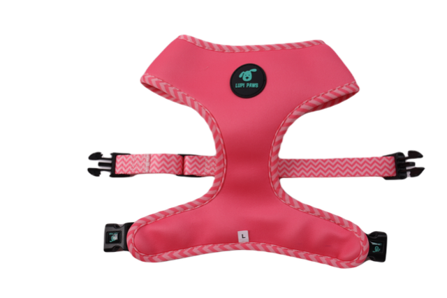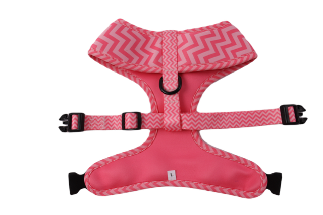 The Pink harness! It’s reversible, with pink stripes on one side and a solid pink on the other.