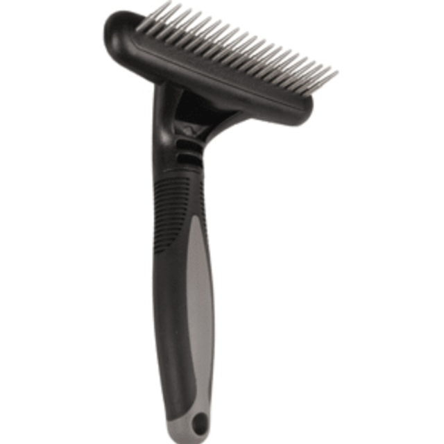 The undercoat rake is ideal for removing loose or dead hairs from the under-coat, swiftly and efficiently. By using the undercoat rake, you'll also prevent hairs from getting tangled. Use the rake before bathing or showering your dog. The outercoat remains intact. Clean the undercoat rake regularly using water and an antiseptic solution such as Dettol or Barbicide, in order to prevent bacterial growth; then allow to dry out thoroughly. For dog breeds such as Collie, Sheltie, Samoyed, etc.